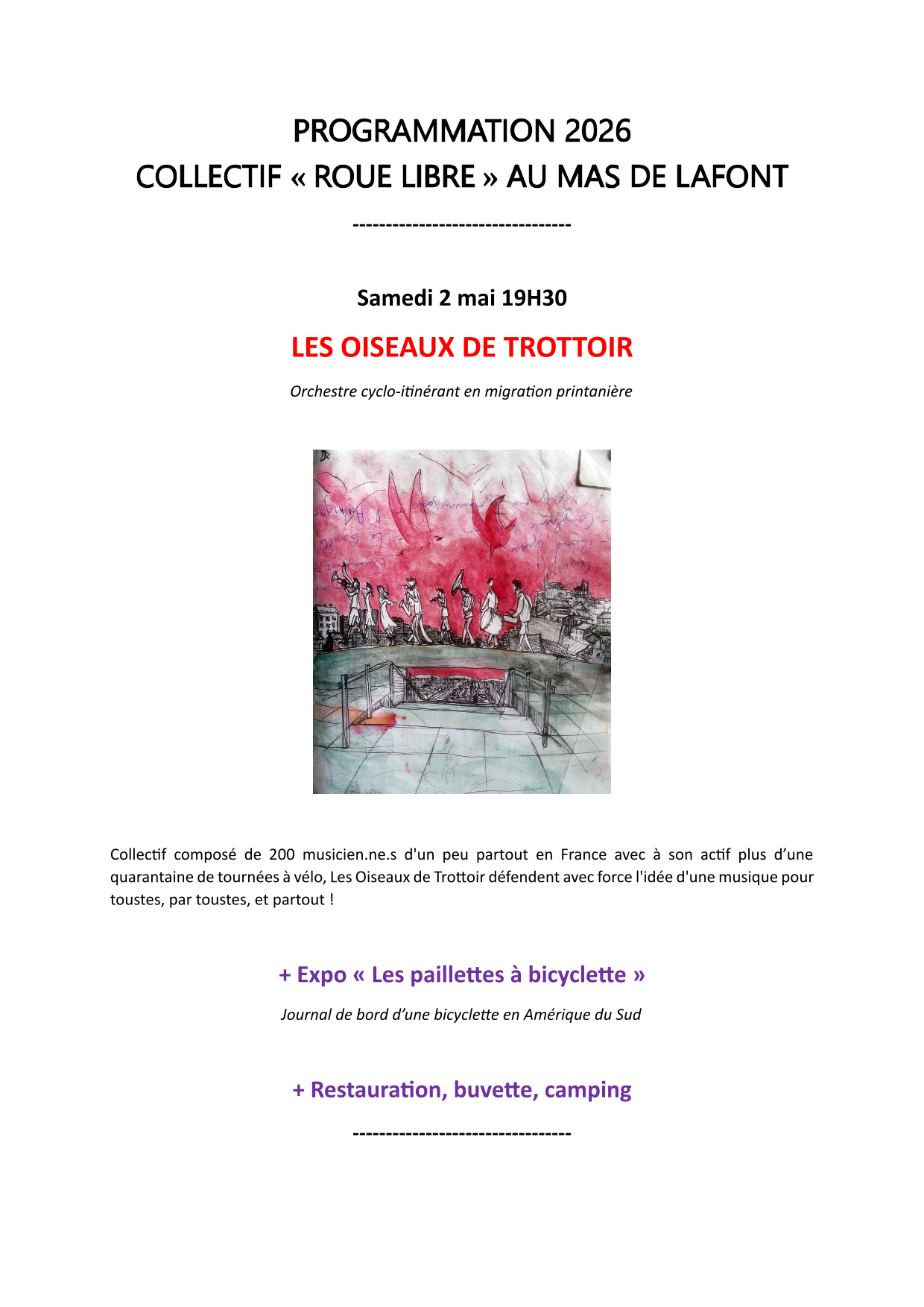 Collectif composé de 200 musicien.ne.s d’un peu partout en France avec à son actif plus d’une quarantaine de tournées à vélo, Les Oiseaux de Trottoir défendent avec force l’idée d’une musique pour tous et toutes, par tou et toutes, et partout ! Vous pourrez également découvrir l’exposition « pailette à bicyclette ». Restauration, buvette et camping sur place.