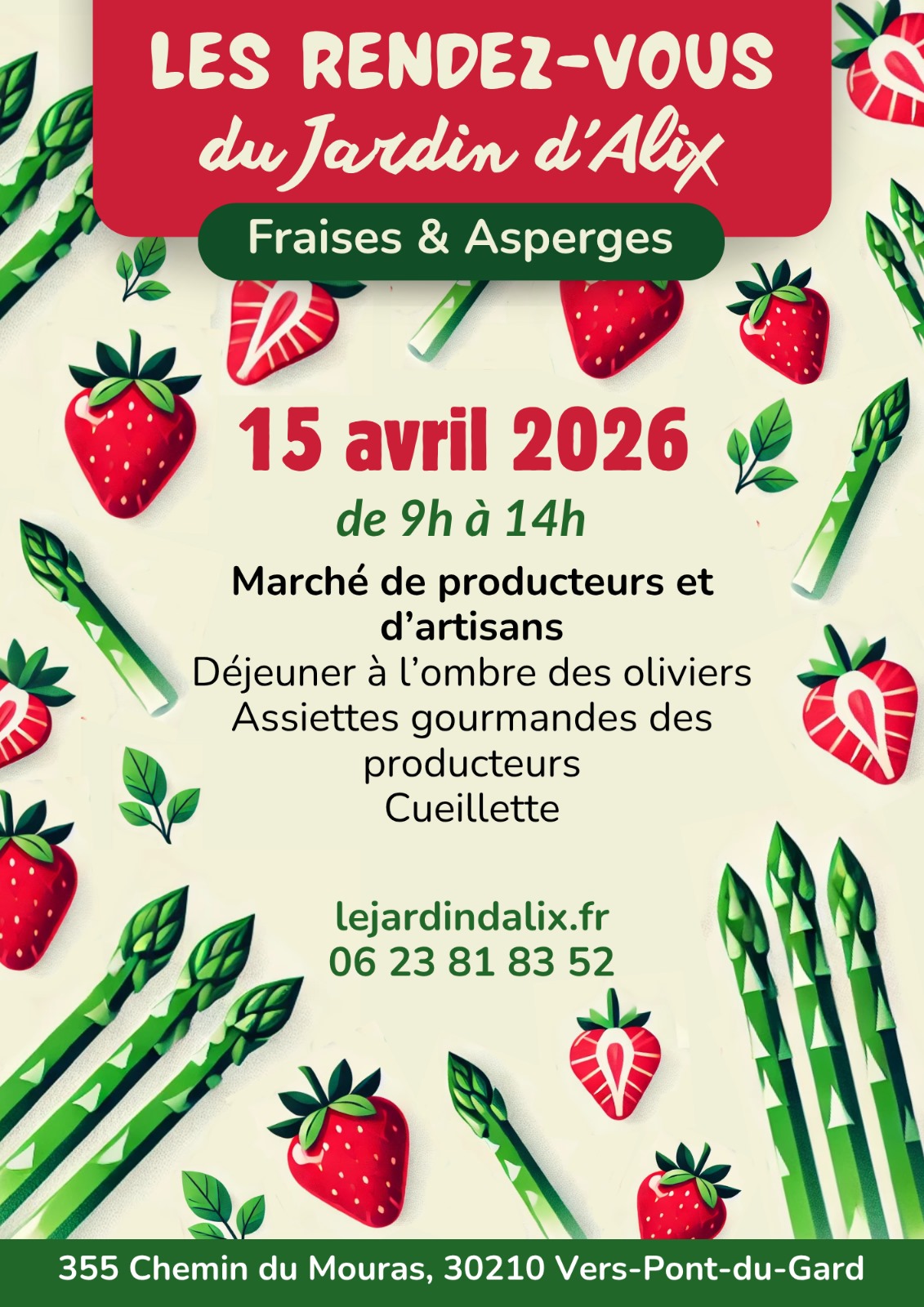 Le Jardin d’Alix vous donne rendez-vous pour une matinée gourmande autour des fraises et des asperges. Marché de producteurs et d’artisans, déjeuner à l’ombre des oliviers, assiettes gourmandes et visite de l’exploitation avec cueillette.