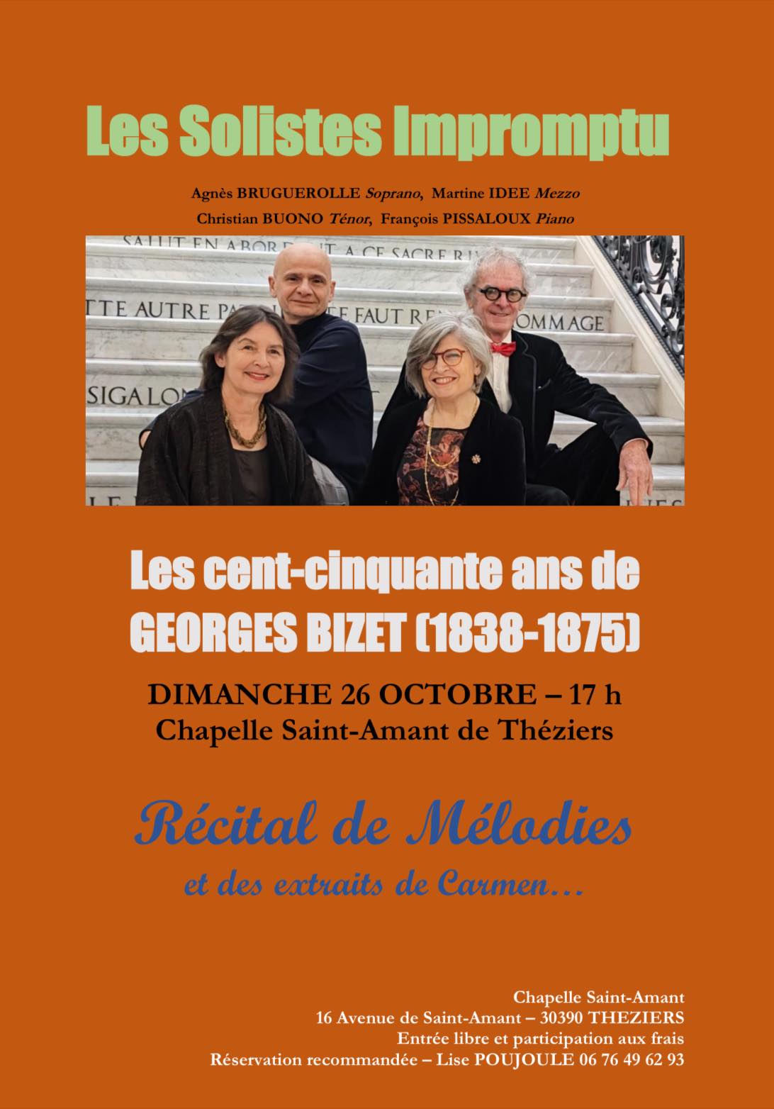 Les solistes Impromptu célèbrent les 150 ans de Georges Bizet (1838 – 1875) avec un récital de mélodies et des extraits de Carmen.Dimanche 26 octobre – 17 h – Chapelle Saint Amant de Théziers.
