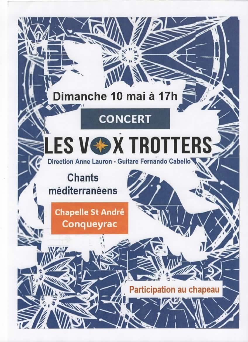 Concert des Vox Trotters à la chapelle Saint-André de Conqueyrac ! Sous la direction d’Anne Lauron et accompagnés à la guitare par Fernando Cabello, les choristes vous emmènent sur les rives de la Méditerranée le temps d’un voyage en chansons.