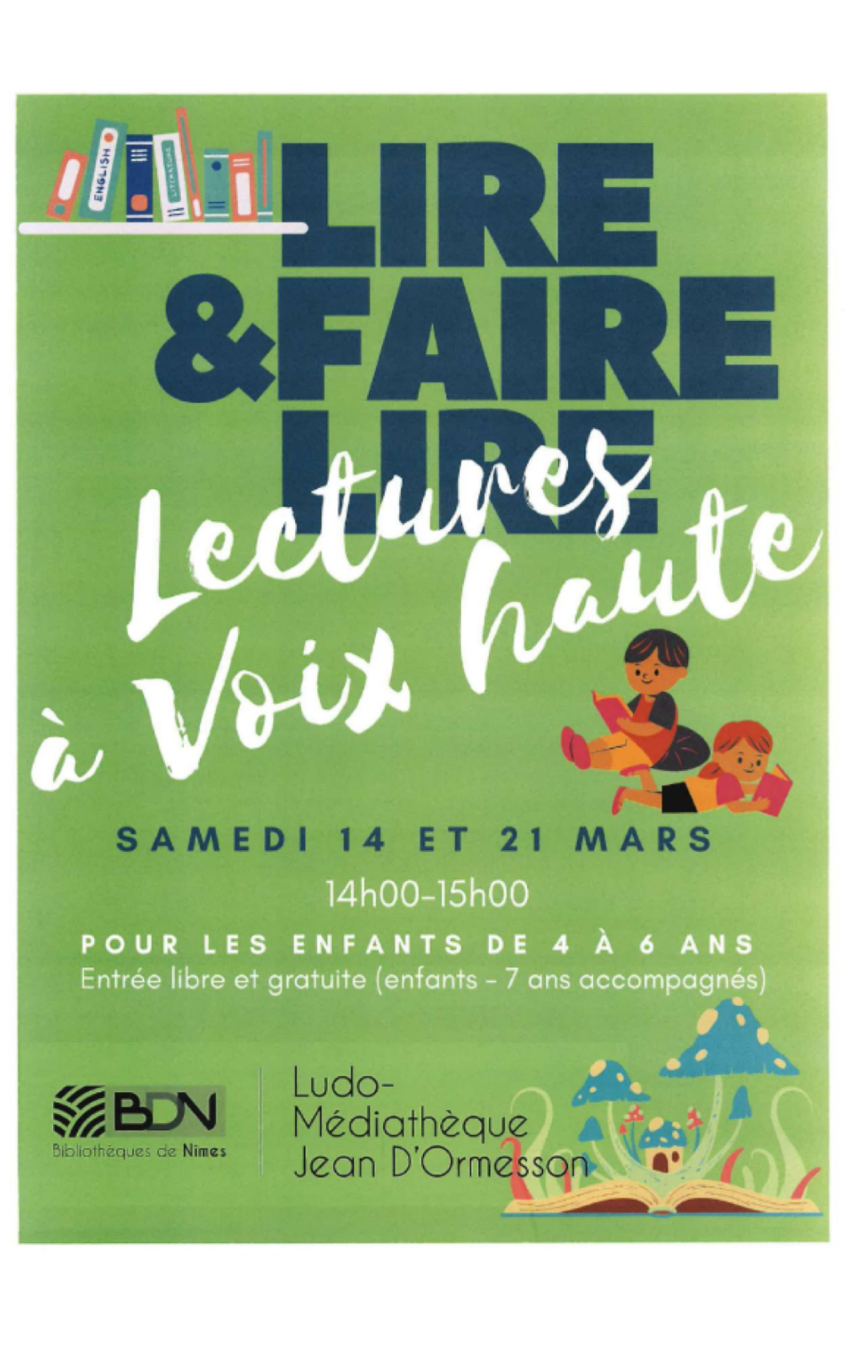 Lectures par des bénévolesCes lectures s’adaptent à l’âge des enfants présents au niveau du choix des textes.