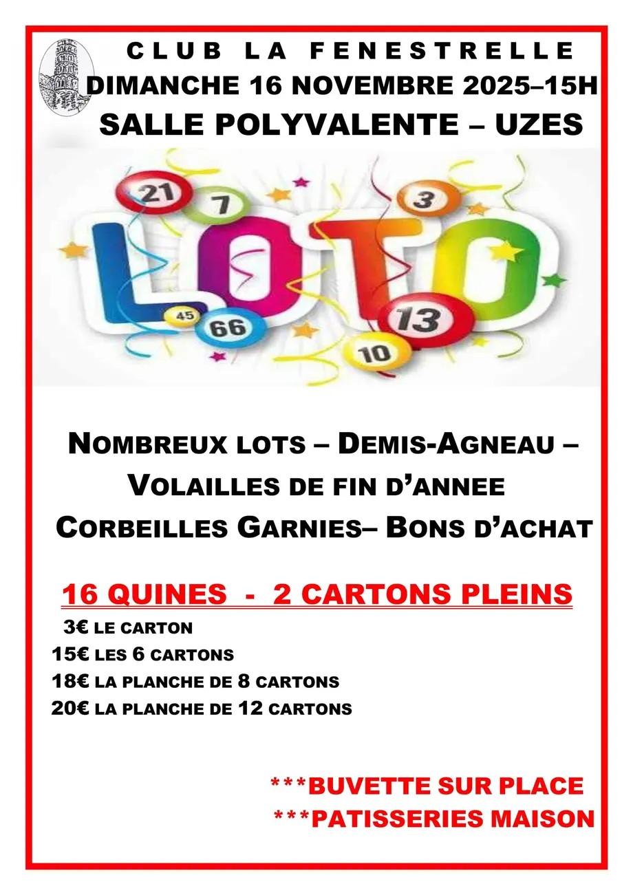 Le club la Fenestrelle organise son loto annuel avec de nombreux lots à gagner. 16 quines, 2 cartons pleins. Venez nombreux tenter votre chance !Rdv le dimanche 16 novembre, à la salle polyvalent d’Uzès, à 15h.Buvette sur place et pâtisseries maison.