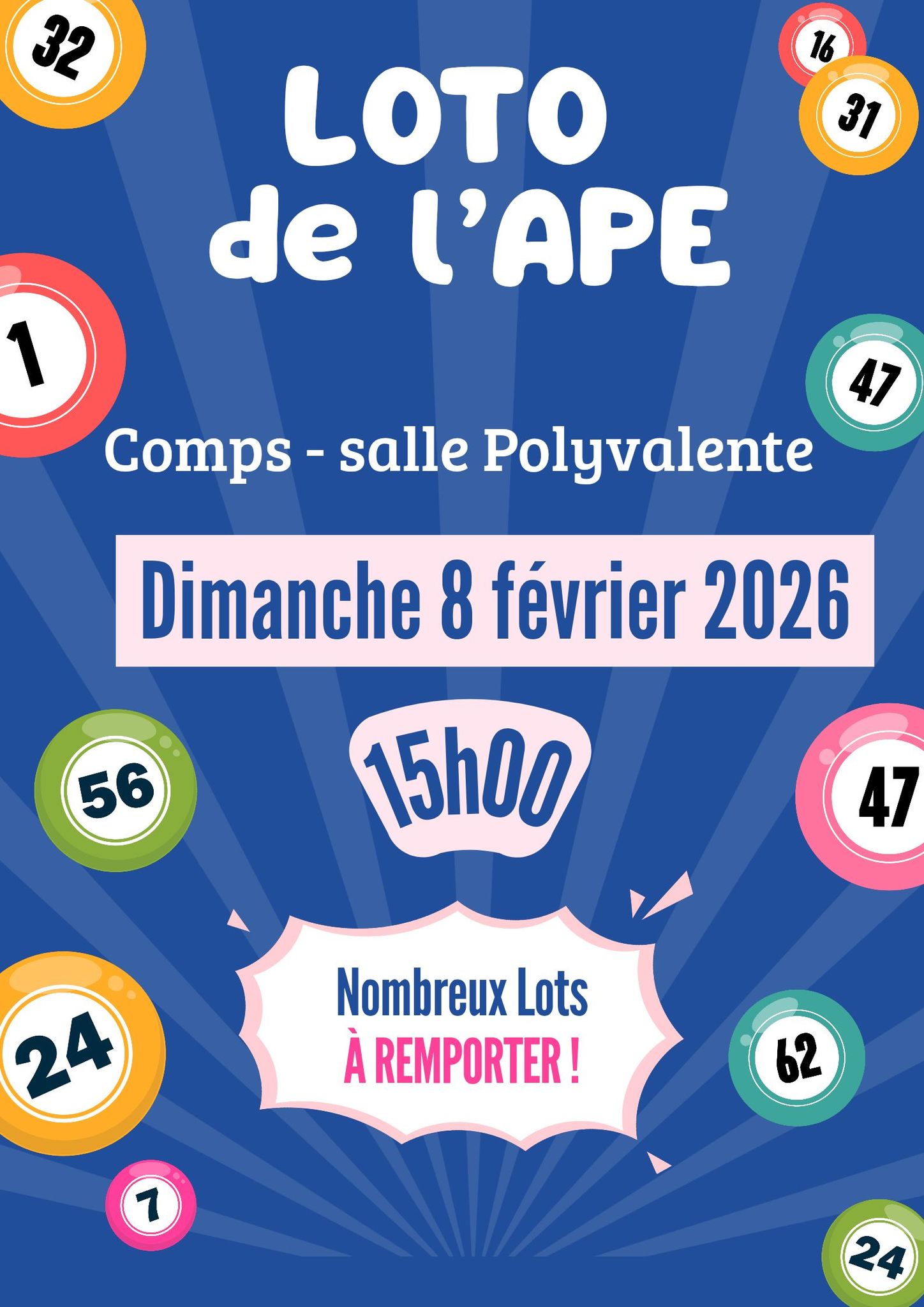 Gardez tous les sens en éveil, les oreilles aux aguets, le regard vif, prêt à dégainer au bon numéro ! Loto organisé par l’APE, un grand moment convivial et familial ouvert à tous.