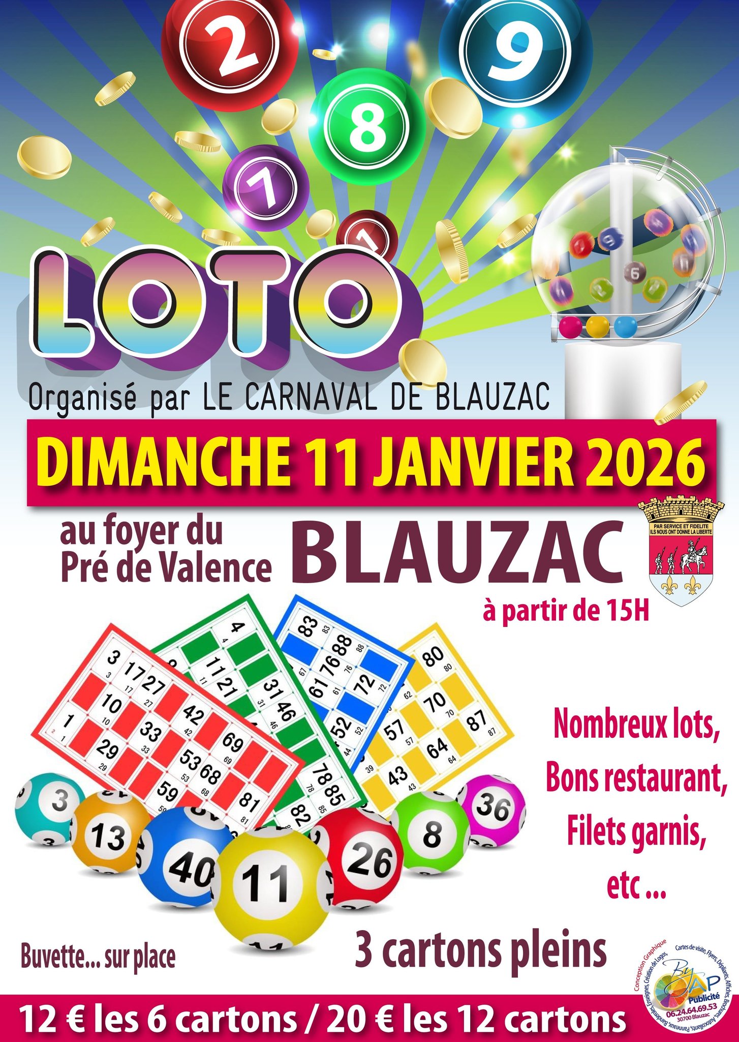 L’association Carnaval de Blauzac organise son loto qui lui permettra de préparer de belles festivités au cours de l’année. 3 cartons pleins et de nombreux lots à gagner.