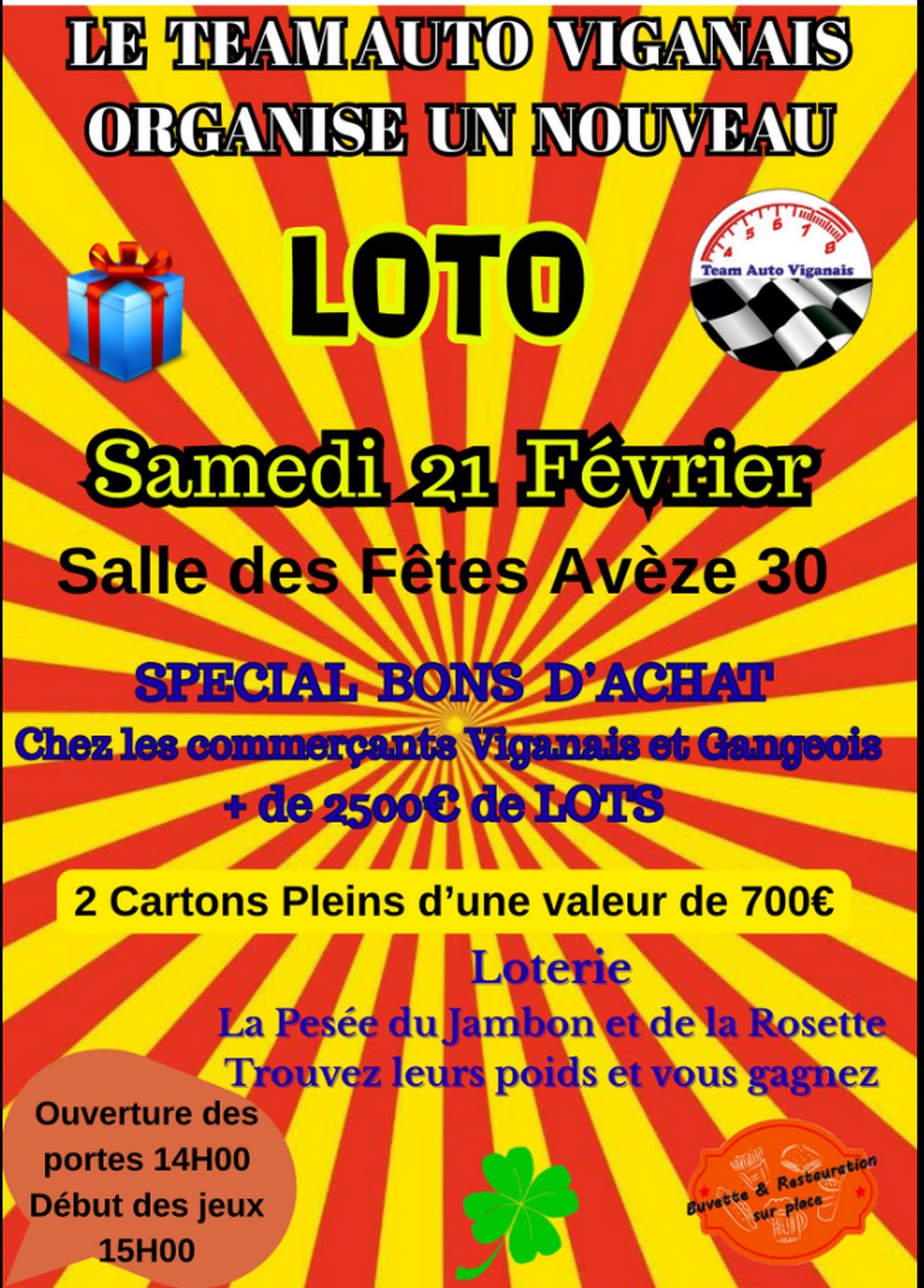 Loto Team Auto Viganais. 2500€ de lots, 2 cartons pleins valeur 700€. loterie. Ouverture des portes à 14h début des jeux à 15h. Buvette et petite restauration sur place. On vous attends nombreux.