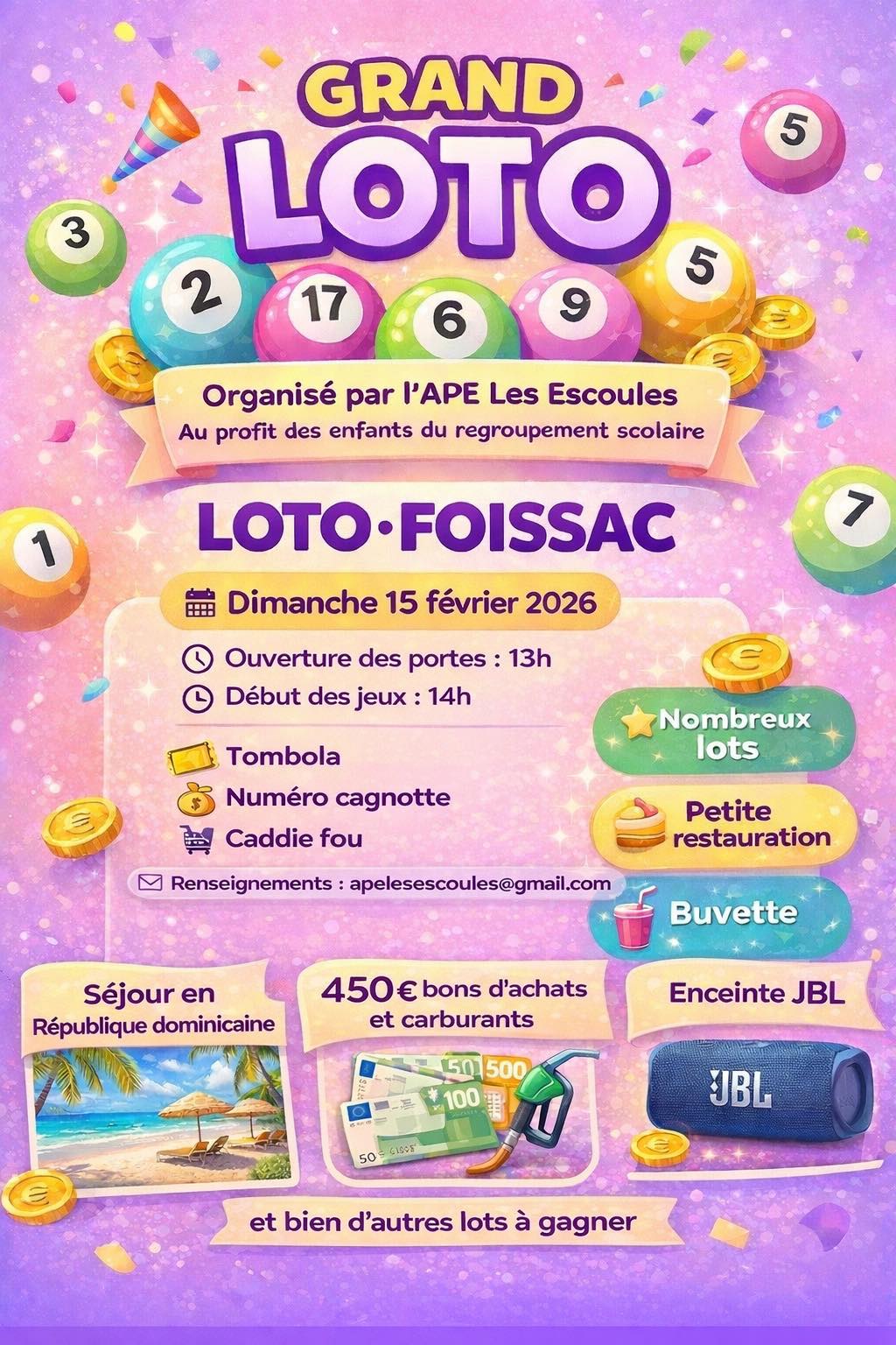 L’APE des Escoules vous propose un loto ! De nombreux lots sont à gagner et le loto est au profit des enfants du regroupement scolaires. Au programme : loto, tombola, numéro cagnotte, caddie fou, séjour en République Dominicaine !