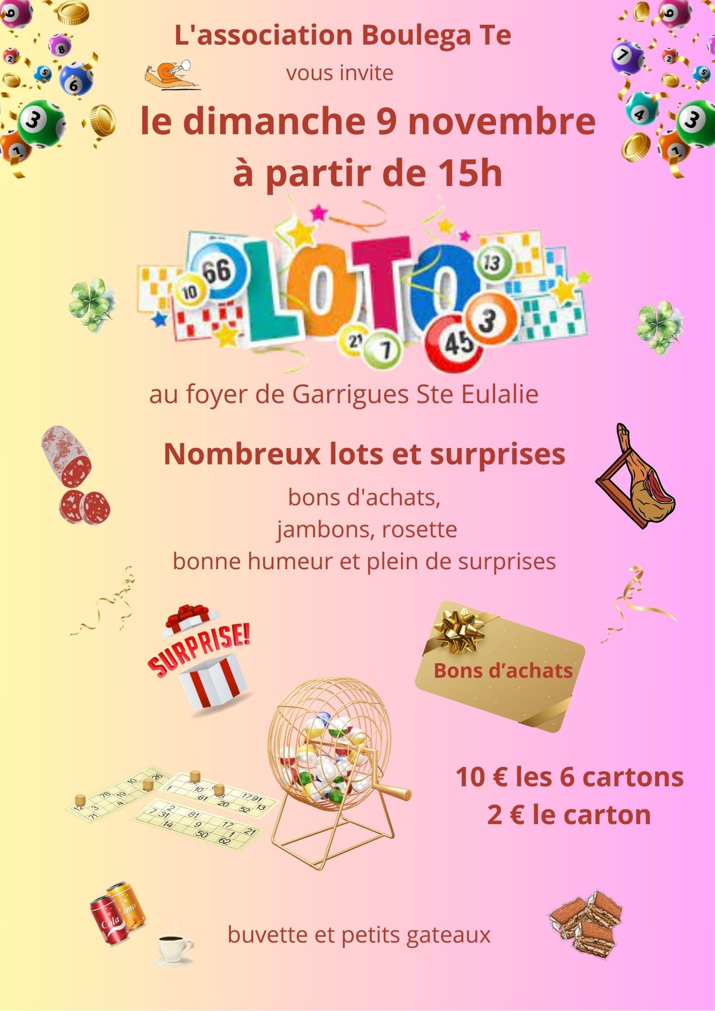 L’association Boulega Te vous invite à son loto annuel. De nombreux lots et bons d’achats vous y attendent. N’hésitez pas à venir partager un moment de convivialité. Buvette et petits gâteaux sur place.