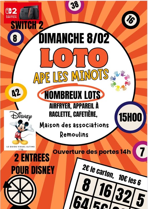 L’APE organise son loto annuel : venez tenter de gagner de nombreux lots ! L’occasion également de passer un bon moment en famille ou entre amis. Lot enfant : un carton plein spécial avec une carte cadeau de 100€ ! Buvette et gourmandises sucrées.