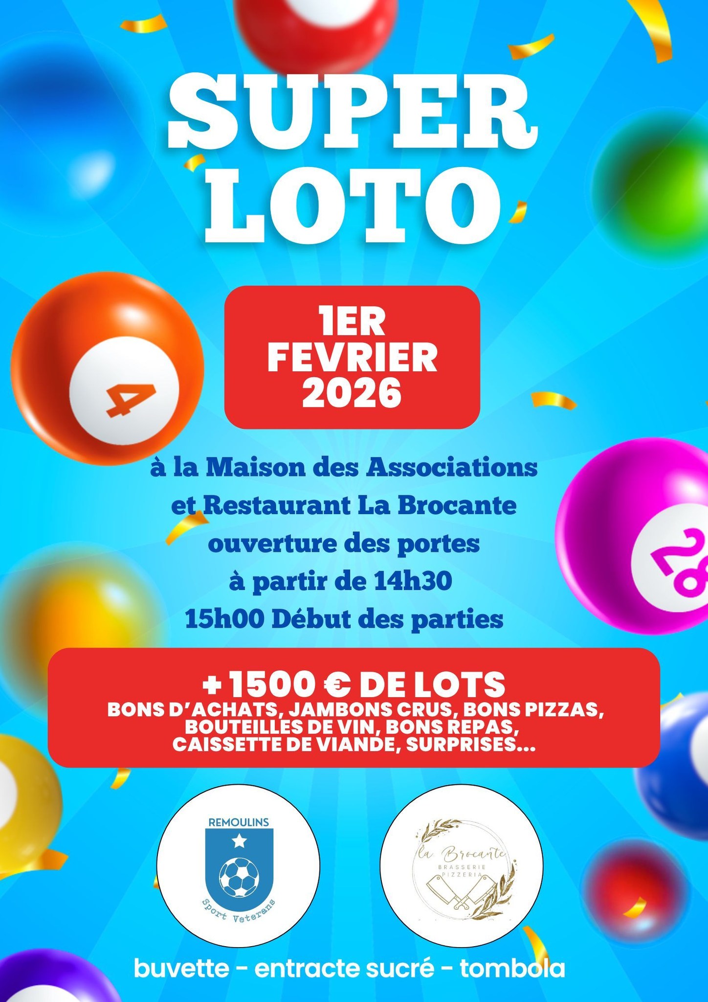 Plus de 1500 € de lots à gagner. Buvette et petite restauration sur place Fun, suspense et bonne humeur garantis !