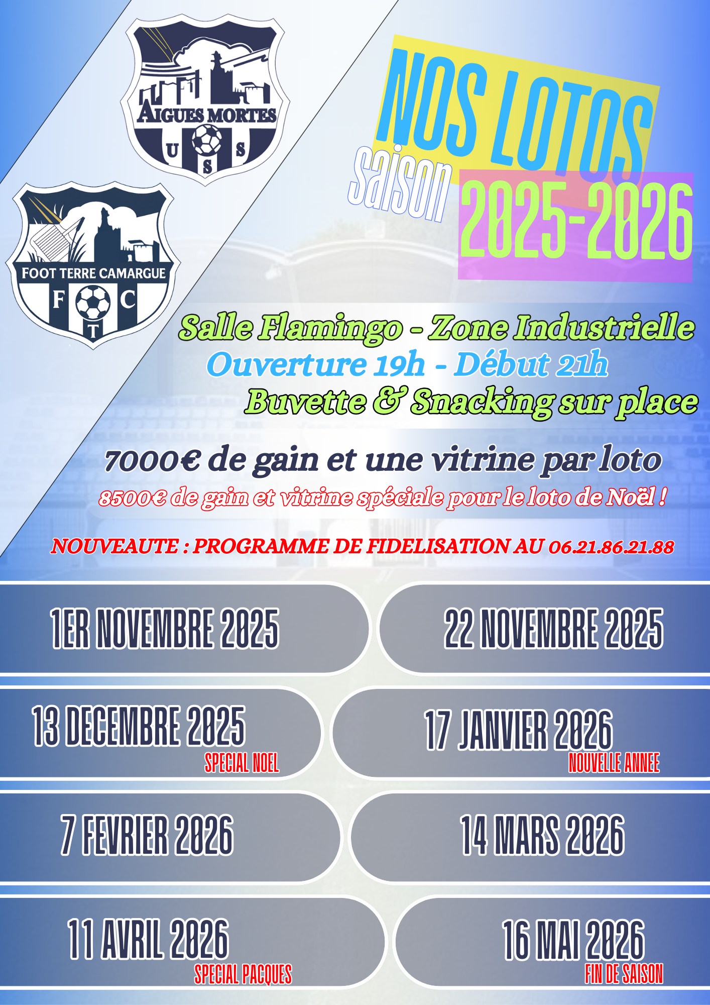 Les loto de l’USSA et Foot Terre Camargue font leur retour. L’ambiance, convivialité et de superbes lots à la clé… ne manquez pas nos grands rendez-vous de la saison.
