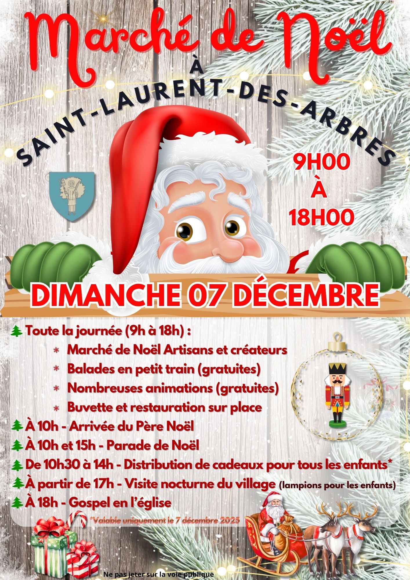Toute la journée de 9h à 18h Marché de noël, artisans et créateurs Balades en petit train gratuites Buvette et restauration sur place A 10h arrivée du Père Noël A 10h et 15h parade de Noël A 10h30 et 14h distribution de cadeaux pour les enfants A partir de 17h visite nocturne du village avec lampions pour les enfants A 18h gospel en l’église