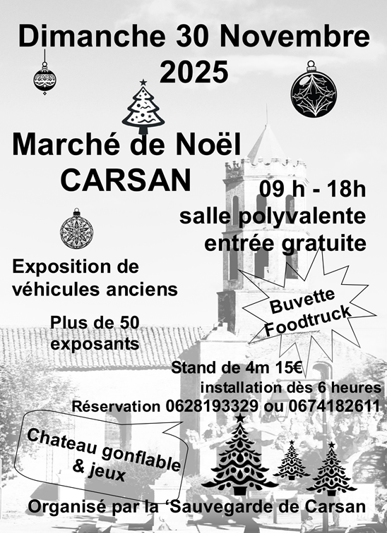 Une belle façon commencer la saison des fêtes de fin d’année avec le marché de noël de Carsan. Une cinquantaine d’exposants vous attendent : créateurs, artisans producteursExpositions de voitures anciennes, château gonflable – buvette – foodtruck