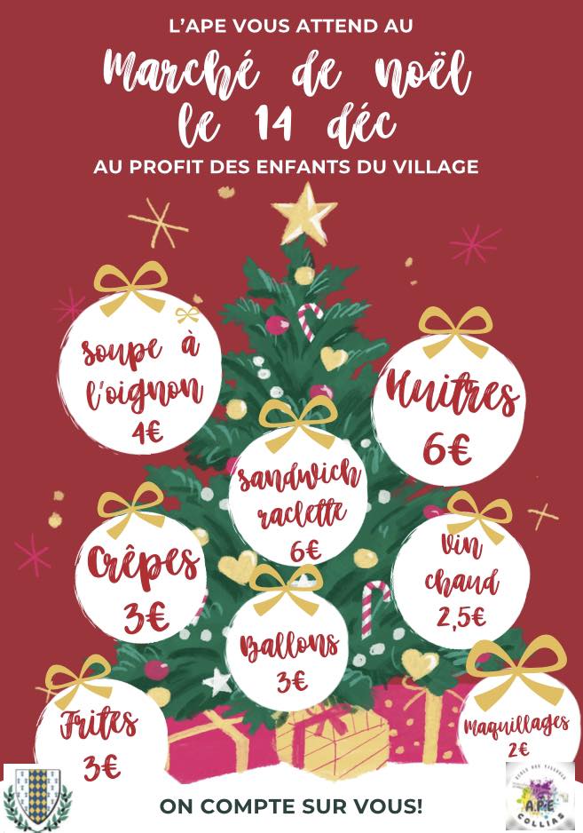 Pour vous restaurer : – huitres, raclette, vin chaud, gaufres – buvette et restauration sur place par l’APE