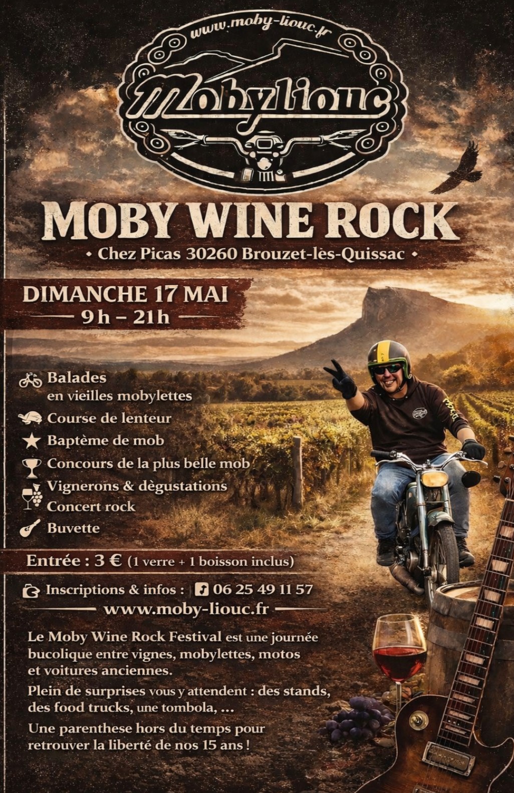 Mobyliouc vous donne rendez-vous le dimanche 17 mai 2026 de 9h à 21h chez Picas, à Brouzet-lès-Quissac, pour le Moby Wine Rock Festival — une journée bucolique entre vignes, mobylettes, motos et voitures anciennes.