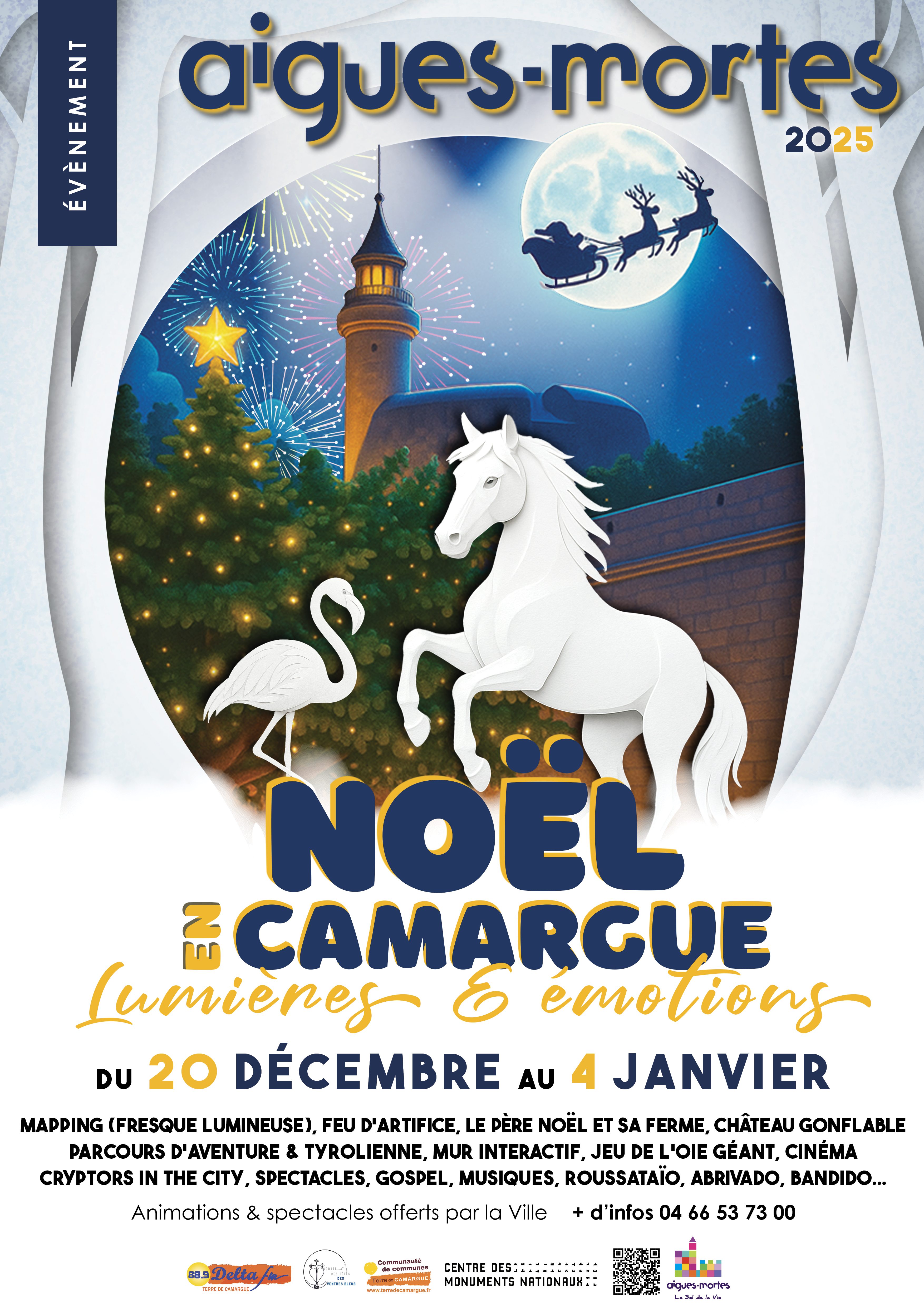 Du 20 décembre au 4 janvier, vivez la magie des fêtes au cœur de la cité médiévale ! Parcours d’aventure, tyrolienne, mur interactif, jeux géants, spectacles pour enfants, orgue de barbarie, gospel, Père Noël et sa ferme raviront petits et grands. Ne manquez pas la roussataïo, le feu d’artifice du 31 décembre et les mappings lumineux. Découvrez aussi la nouvelle chasse aux Cryptors, une aventure urbaine interactive gratuite ! Animations, musique, films, traditions camarguaises et ambiance féerique vous attendent pour des fêtes inoubliables.