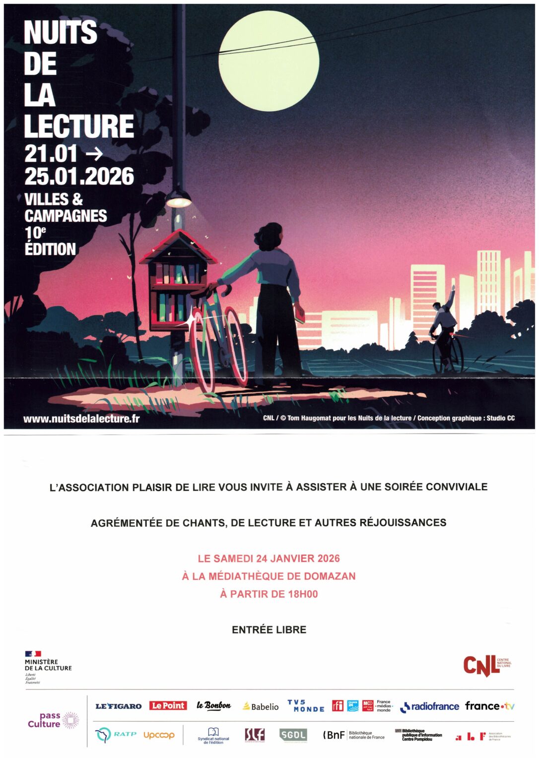 À l’occasion de la 10e édition des Nuits de la lecture sur le thème « Villes et campagnes », l’association Plaisir de lire vous invite à assister à une soirée conviviale agrémentée de chants, de lecture et autres réjouissances.