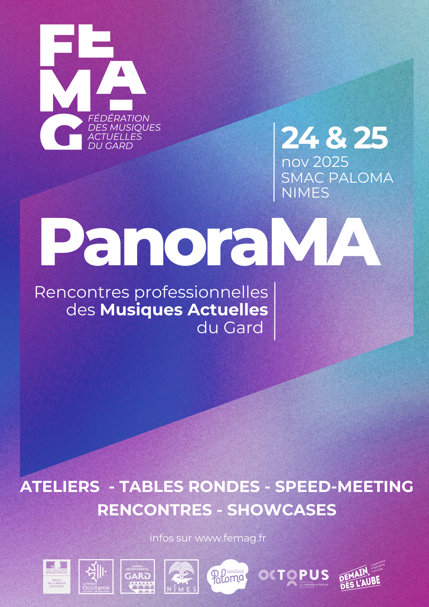 PanoraMA, les rencontres professionnelles des Musiques Actuelles du Gard, auront lieu les 24 & 25 novembre 2025 à Paloma ! Organisées par la FéMAG en partenariat avec Octopus, Demain Dès l’Aube et Paloma, ces rencontres sont l’occasion de rassembler les professionnel·le·s et bénévoles de la filière, les artistes, les curieuses et curieux en quête d’échange et d’interconnaissance, pour deux journées d’ateliers, tables rondes, conférences, showcases, d’un speed-meeting Musiques Actuelles et d’autres moments conviviaux. Toutes les infos seront à retrouver en septembre sur le site de la FéMAG, www.femag.fr