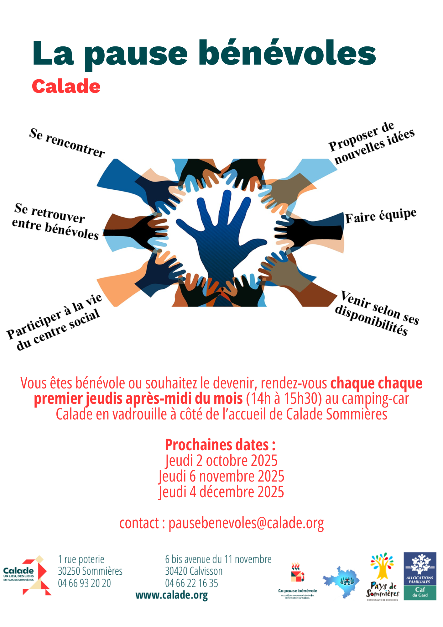 La pause bénévoles de Calade vous accueil à Calade Sommières pour faire connaissance sur les possibilités de bénévolat à CaladeLa pause bénévoles de Calade vous accueil à Calade Sommières pour faire connaissance sur les possibilités de bénévolat à Calade.