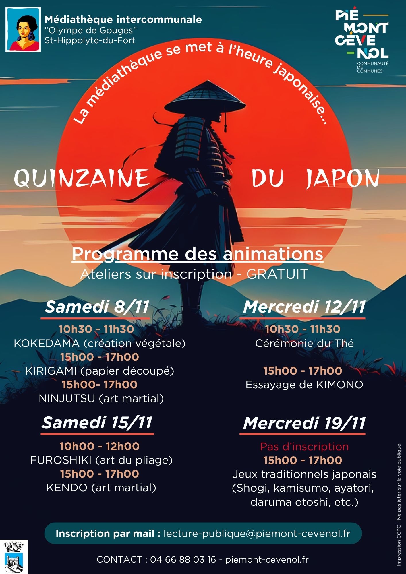Des ateliers participatifs vous plongent dans la Quinzaine du Japon. Venez découvrir, et pourquoi pas essayer des pratiques japonaises.Programme des animations: