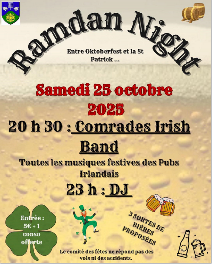 Soirée concerts RamDan Night à Lanuéjols, à la salle des fêtes de Lanuéjols, à partir de 20h30. En première partie, toutes les musiques festives des pubs Irlandais avec « Comrades Irish Band », à 23h : DJ. Entrée : 5€ avec une conso offerte. Trois sortes de bières proposées. Organisé par le Comité des fêtes et Demain dès l’aube.