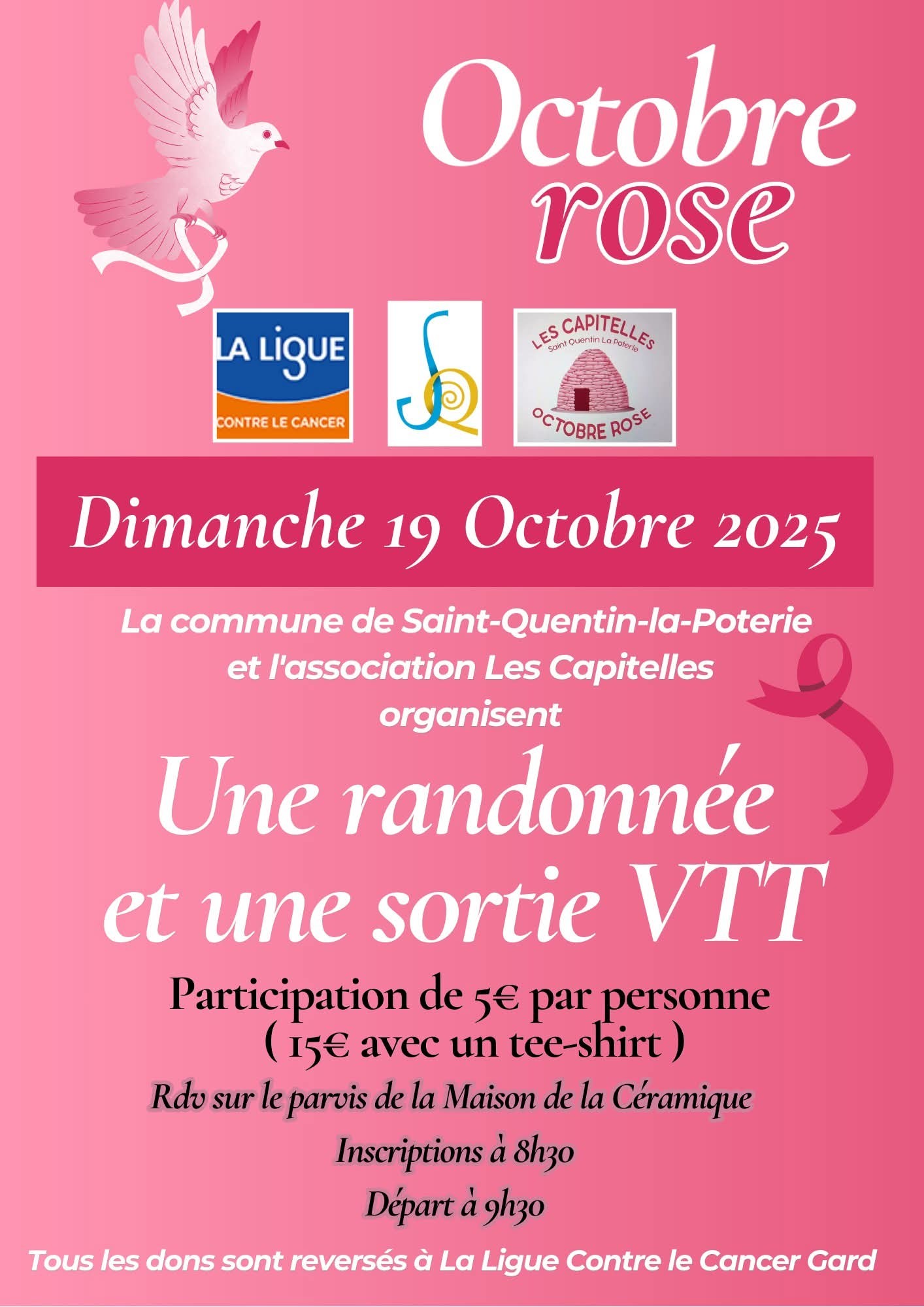 La Commune et l’association les Capitelles organisent une randonnée et une sortie VTT au profit d’octobre rose.Randonnée : 6 kmVTT : niveau moyen. 20 km (à partir de 14 ans). 8h30 pour les inscriptions.Départ à 9h30.