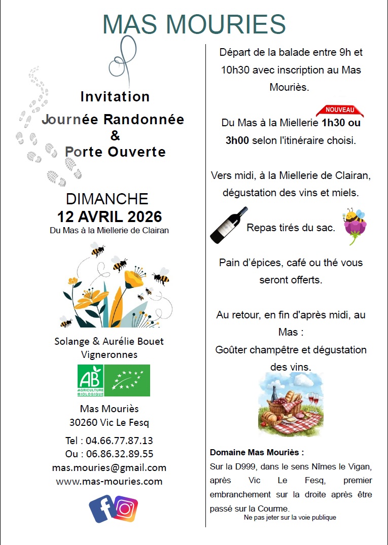 Entre 9h00 et 10h30 départ du Mas Mouriès, deux sentiers aux choix 1h30 ou 3h jusqu’à la Miellerie de Clairan. A midi à la Miellerie : dégustation des vins et miel. Café, thé et pain d’épices offerts. Retour au Mas Mouriès : goûter champêtre et dégustation des vins.