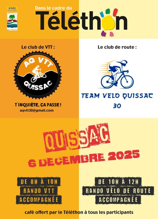 Rando VTT organisée par AQ VTT de Quissac de 8h à 10h et rando vélos de route organisée par Team Vélo Quissac de 10h à 12 h. Café offert par le Téléthon aux participants. Lieu de rendez vous: Foyer Désiré Rousset, champs de foire.