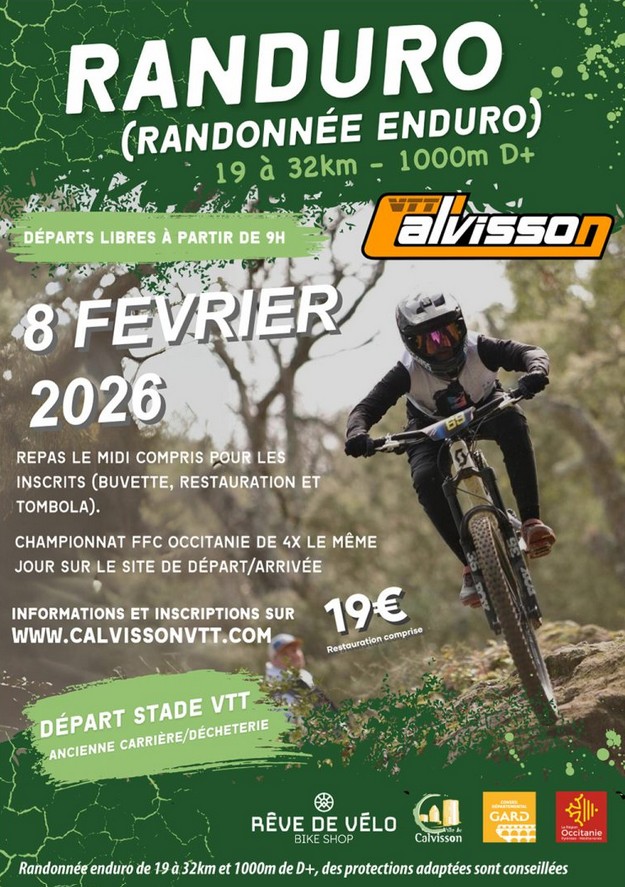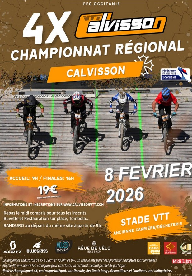 Une randonne Enduro et le championnat régional de 4X seront organisées sur la journée.Une randonne Enduro et le championnat régional de 4X seront organisées sur la journée. Sur inscription en ligne sur Calvisson VTT.