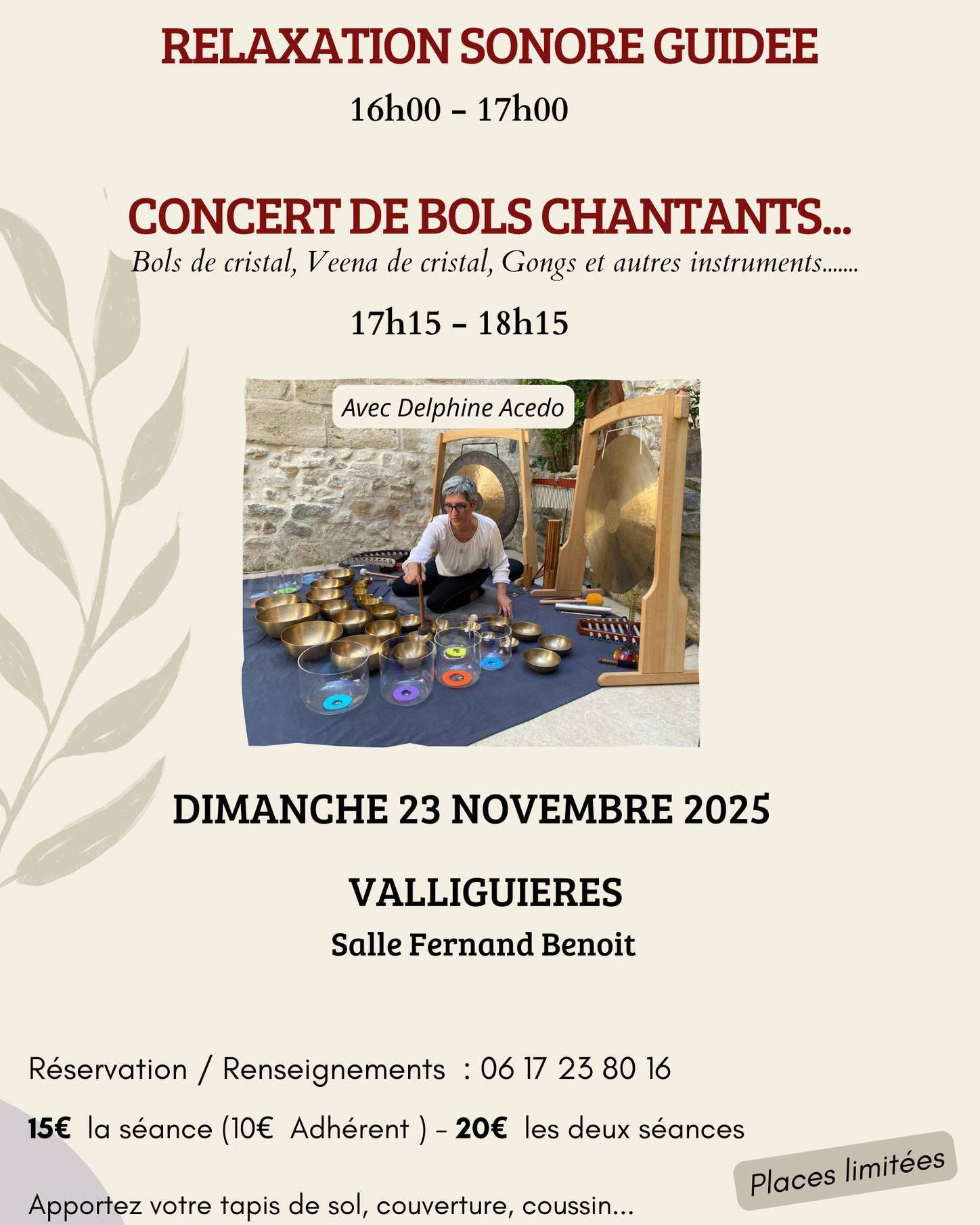 16 h 00 – 17 h 00 : Relaxation sonore guidée. Un voyage intérieur tout en douceur, porté par la vibration du son.