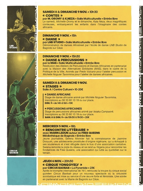 Grand marché avec une trentaine de de stands d’artisanat de plusieurs pays d’afrique. Bijoux, épices, tissus, livres etc …Ateliers, déambulation, défilé, concert …