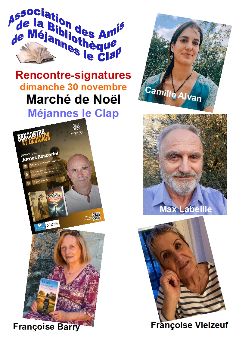 Rencontres de 5 écrivains : Camille Alvan, Max Labeille, Françoise Vielzeuf, Françoise Barry, et James Boscariol. Avec séances de signatures Organisé par l’Association Les Amis de la Bibliothèque
