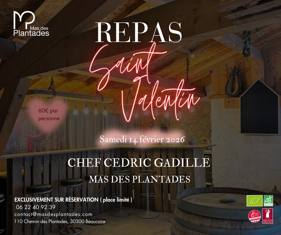 Quand l’amour se déguste comme un grand cru…Pour la Saint-Valentin, le Mas des Plantades vous donne rendez-vous pour un dîner d’exception imaginé et sublimé par le Chef Cédric GADILLE où les cœurs s’accordent aussi bien que les vins.
