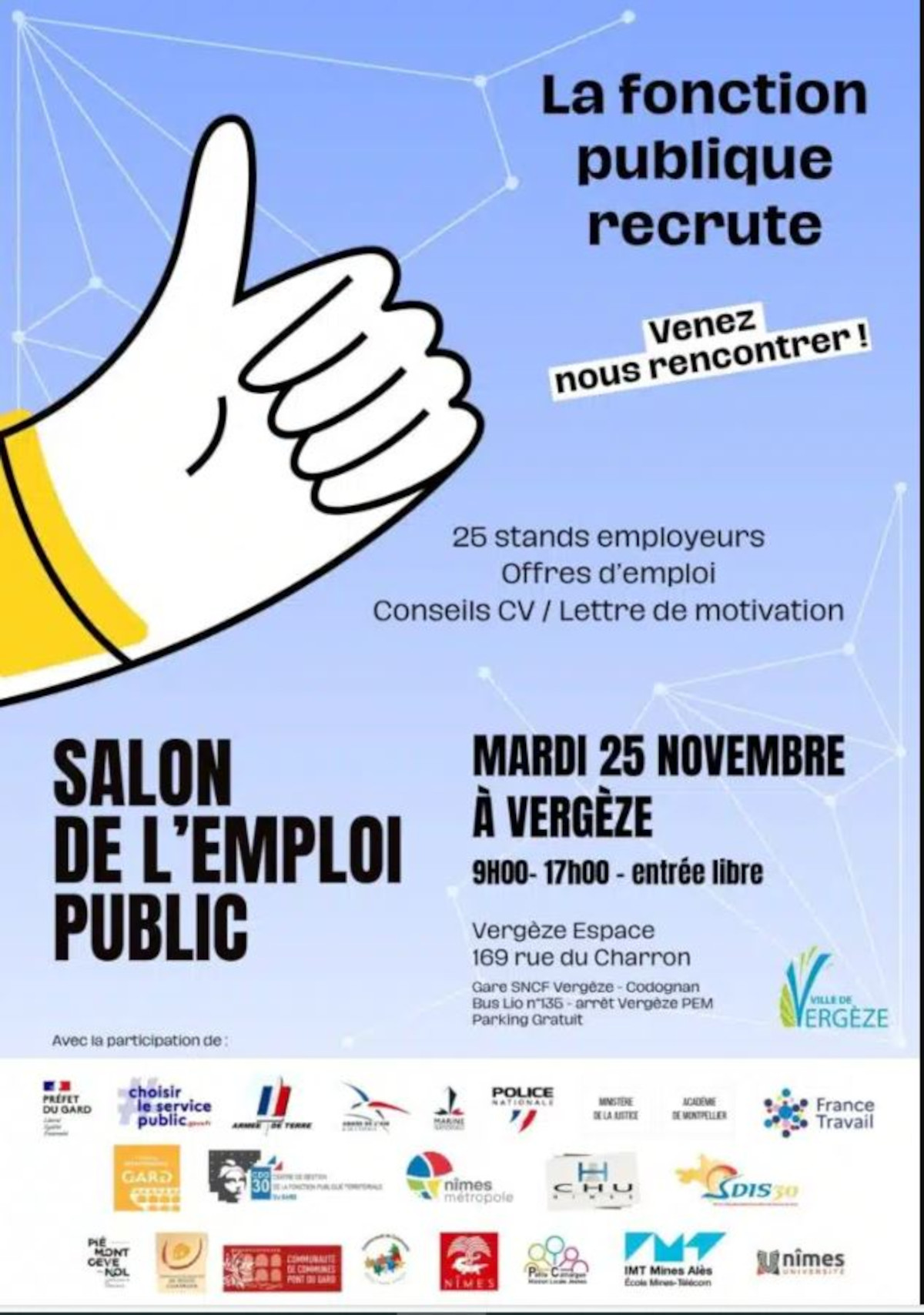 – 25 stands employeurs : Etat (Préfecture, éducation, police, justice, armées), centres hospitaliers, collectivités territoriales et établissements publics.