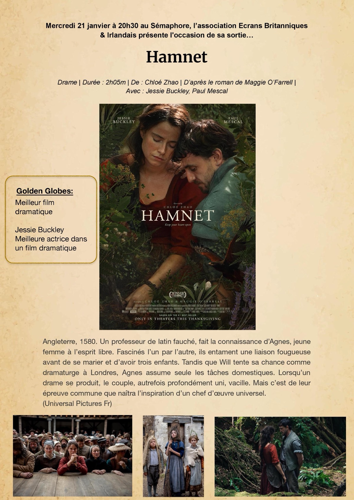 Séance de présentation du 29e festival Ecrans Britanniques & Irlandais, ave dévoilement de l’affiche et projection d’un film, Hamnet de Chloé Zhao