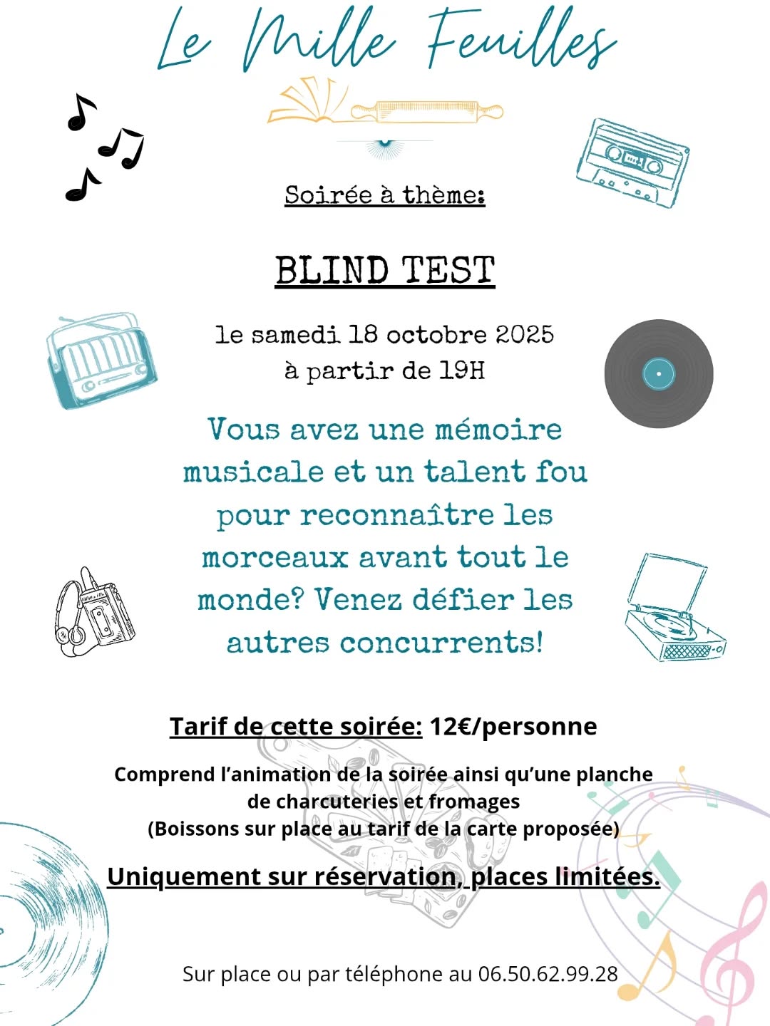 Tarif : 12 €, comprenant l’animation de la soirée et une planche de charcuterie / fromage. Boissons sur place aux tarifs de la carte. Uniquement sur réservation, sur place ou par téléphone : 06 50 62 99 28.