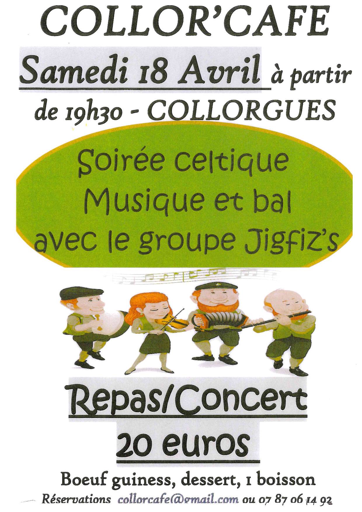 Préparez-vous à danser et chanter aux rythmes celtiques, car voici venu la nouvelle soirée à thème de Collor’Café : une soirée celtique. Au programme : musique et bal, avec le groupe Jigfiz’s, et bœuf Guiness !Pensez à réserver par mail ou par téléphone.