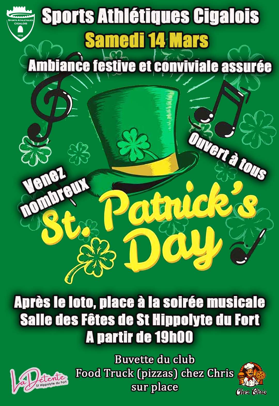 Soirée musicale spéciale Saint-Patrick organisée par le SA Cigalois le samedi 14 mars, à partir de 19h00, à la salle des fêtes de Saint-Hippolyte-du-Fort.Animation DJ, buvette du club et food truck pizzas sur place.Ambiance festive et conviviale assurée