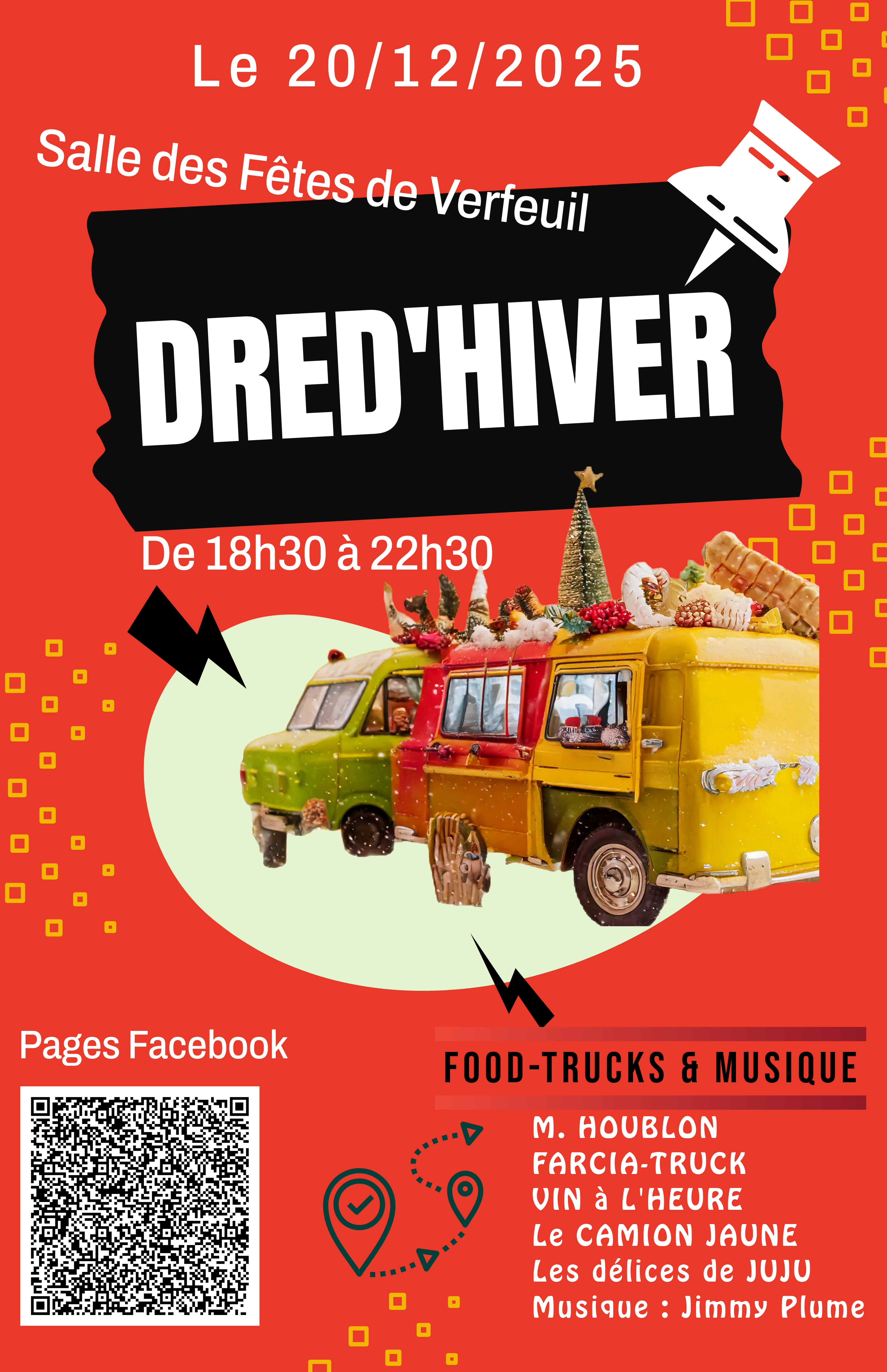 Soirée food trucks et concerts au coeur du villageAvec les food trucks : Vin à l’heure, Farcia Truck, Le Camion Jaune, Les délices de Juju, M. HOUBLON Pour la musique, « Jimmy Plume » animera la soirée avec un solo pop/folk en compo reprises.
