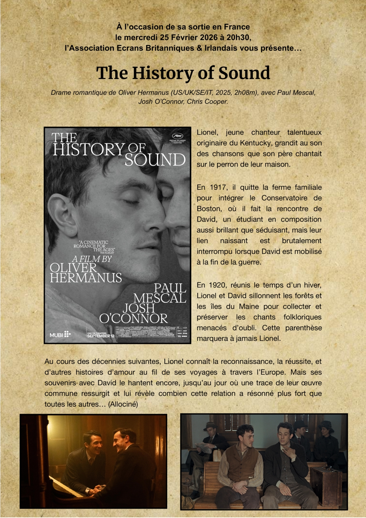 Au cours de cette soirée destinée à accueillir les adhérents anciens et nouveaux, il y aura une présentation du 29e festival Ecrans Britanniques & Irlandais, suivie de la projection du film d’Oliver Hermanus, Le Son des souvenirs (The History of Sound)