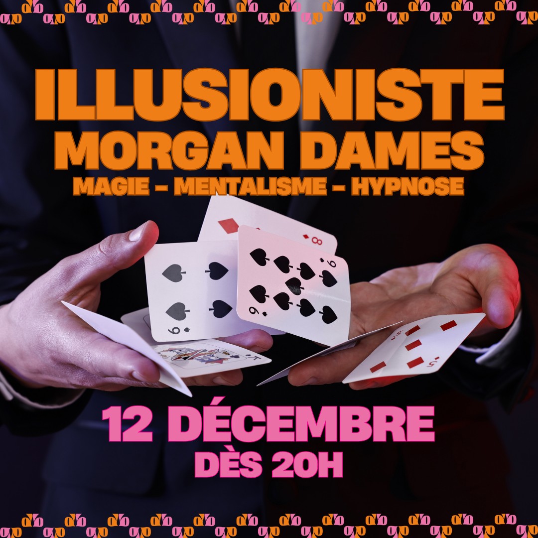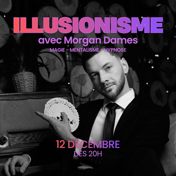 Soirée Illusionnisme avec Morgan Dames. Un dîner-spectacle exceptionnel mêlant magie, mentalisme et hypnose… Un moment étonnant, immersif et gourmand à vivre en petit comité.Réservation fortement conseillée – les places partent vite !