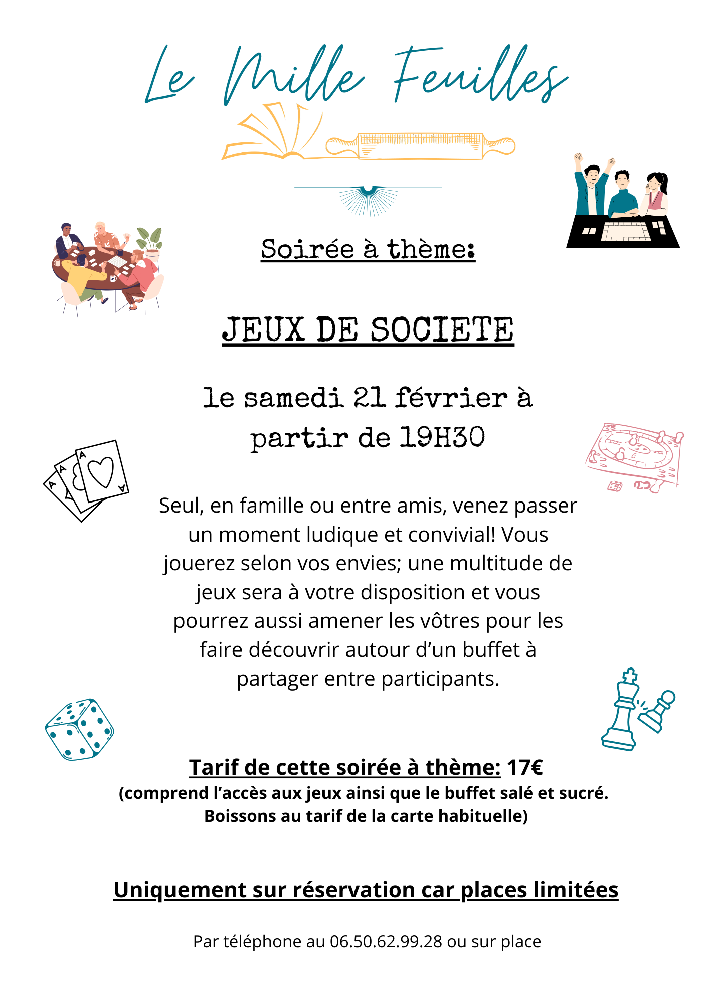 La librairie / salon de thé le Mille Feuilles, vous propose une soirée jeux de société. Seul, en famille ou entre amis, venez passer un moment ludique et convivial ! Une multitude de jeux sera à votre disposition et vous pourrez aussi amener les vôtres.