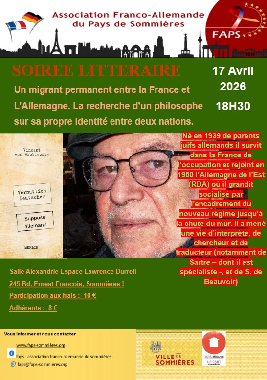 Une soirée avec l’auteur Vincent von Wroblewsky, qui présentera son livre Vermutlich Deutscher et, par là même l’œuvre de sa vie, en langue française. L’auteur est un migrant permanent entre la France et l’Allemagne.