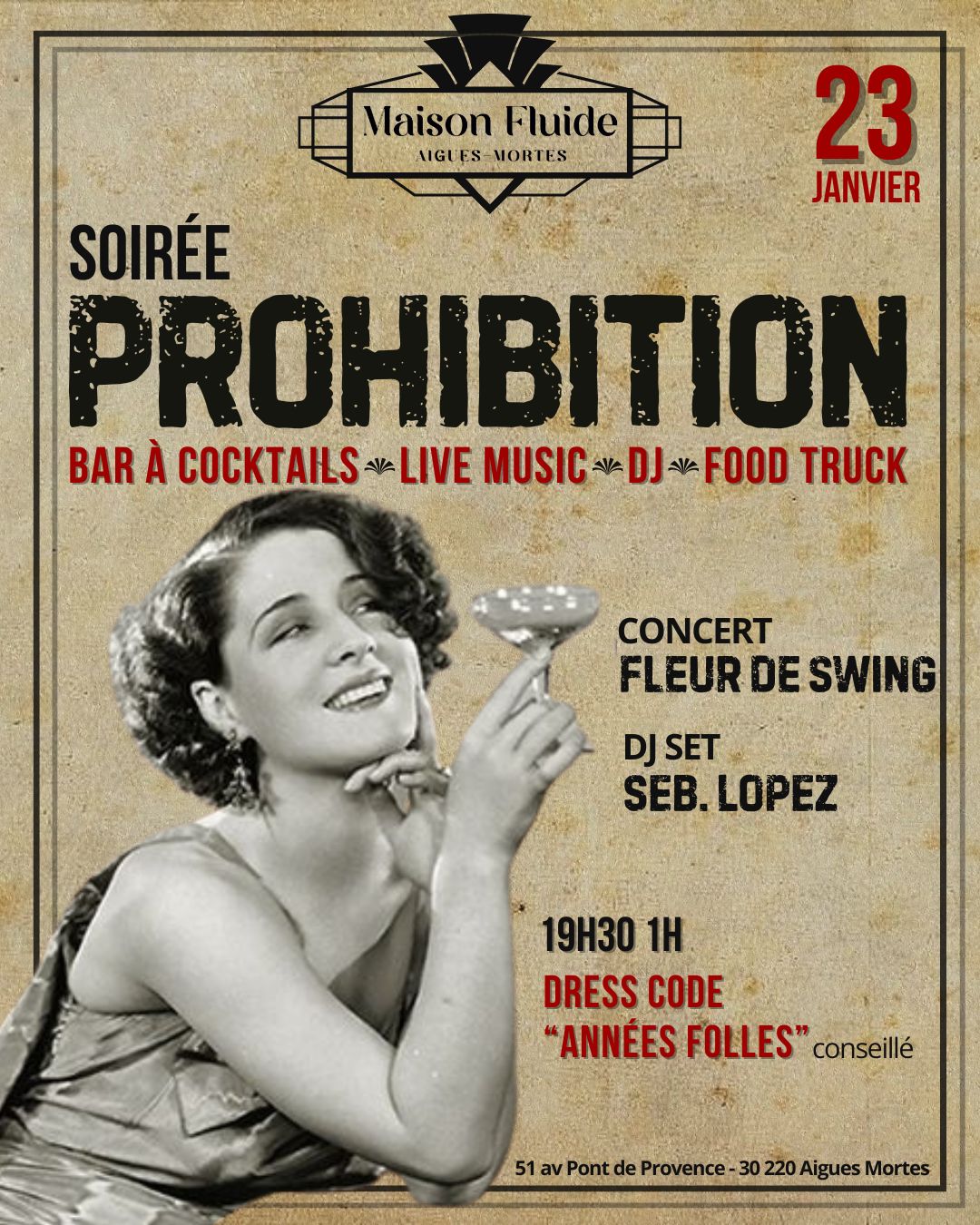 Le 23 janvier à partir de 19h30, Maison Fluide vous invite à une soirée Prohibition. Plongez dans l’ambiance envoûtante des Années folles entre élégance, swing et esprit festif. La soirée débutera avec un concert de Fleur de Swing, suivi d’un DJ Seb Lopez. Profitez d’un food truck et de cocktails inspirés de l’époque. Dress code chic Années 20 fortement conseillé pour une immersion totale.