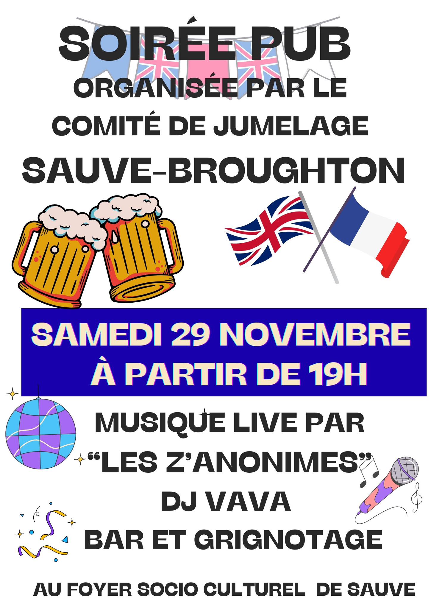 Soirée Pub à Sauve, organisée par le comité de jumelage Sauve–Broughton le samedi 29 novembre à partir de 19hAu programme : Musique live par “Les Z’anonimes”Dj Vava