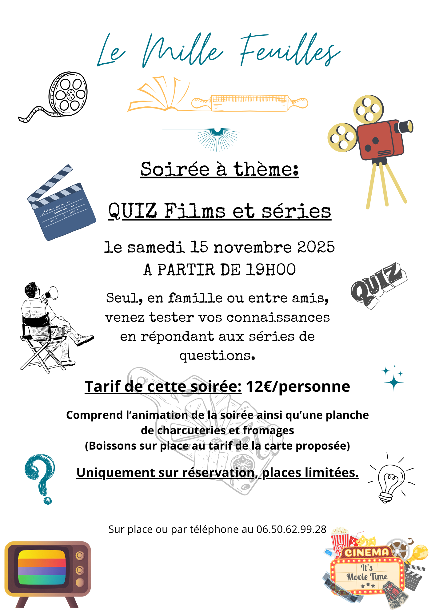 Le Mille Feuilles vous propose une soirée quiz « Films et séries ». Seul, en famille ou entre amis, venez tester vos connaissances en répondant aux séries de questions.