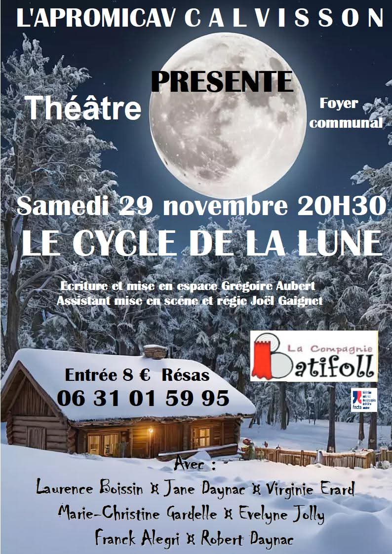 La Compagnie Batifoll présente le cycle de la lune. Soirée organisée par l’Apromicav Calvisson.La Compagnie Batifoll présente le cycle de la lune.Ecriture et mise en espace Grégoire Aubert.Assistant mise en scène et régie Joël Gaignet