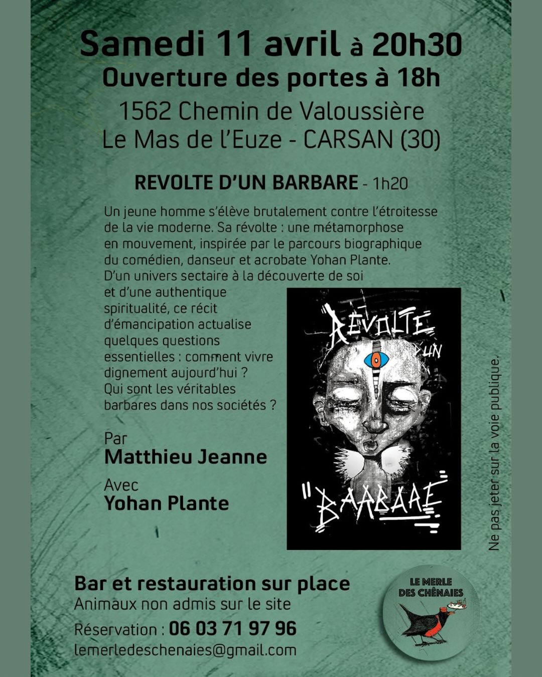 A 20h30, la pièce de théâtre « Révolte d’un Barbare », par la Compagnie Masael Théâtre Un jeune homme s’élève brutalement contre l’étroitesse de la vie moderne. Sa révolte : une métamorphose en mouvement, inspirée par le parcours biographique du comédien, danseur et acrobate Yohan Plante. D’un univers sectaire à la découverte de soi et d’une authentique spiritualité, ce récit d’émancipation actualise quelques questions essentielles : comment vivre dignement aujourd’hui ? Qui sont les véritables barbares dans nos sociétés ?