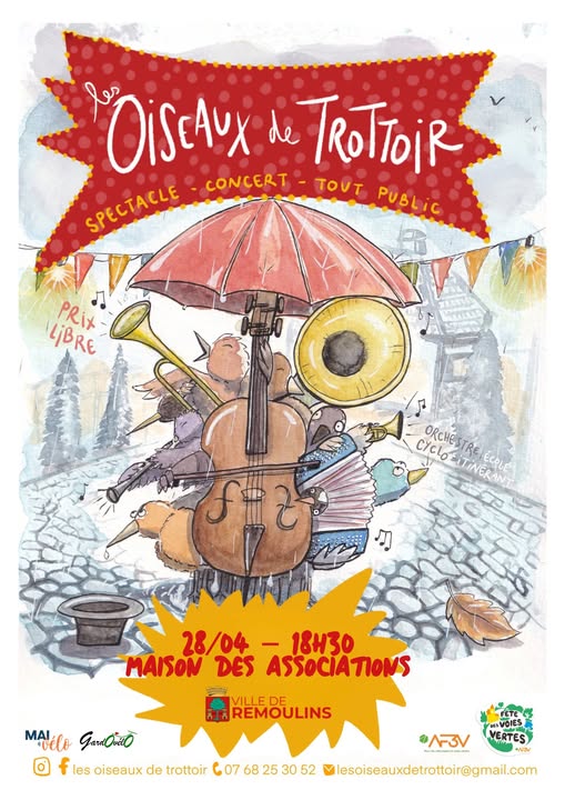 Associations avec l’orchestre cyclo-itinérant « Les Oiseaux de Trottoirs ». Entre cirque et concert, ce spectacle original promet d’enchanter les petits comme les grands !