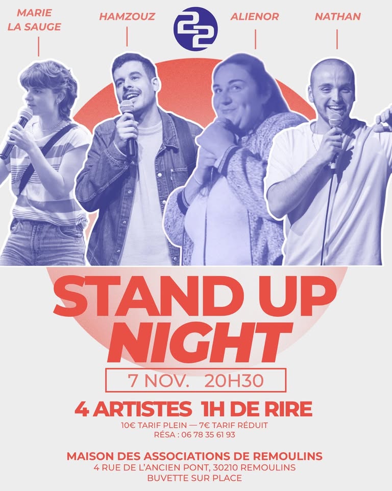 Après 2 spectacles triomphants à Remoulins, Nathan et ses acolytes reviennent pour une nouvelle soirée stand-up pleine de rires, d’énergie et de bonne humeur !Ne manquez pas ce retour très attendu pour découvrir cette nouvelle génération d’humoristes !