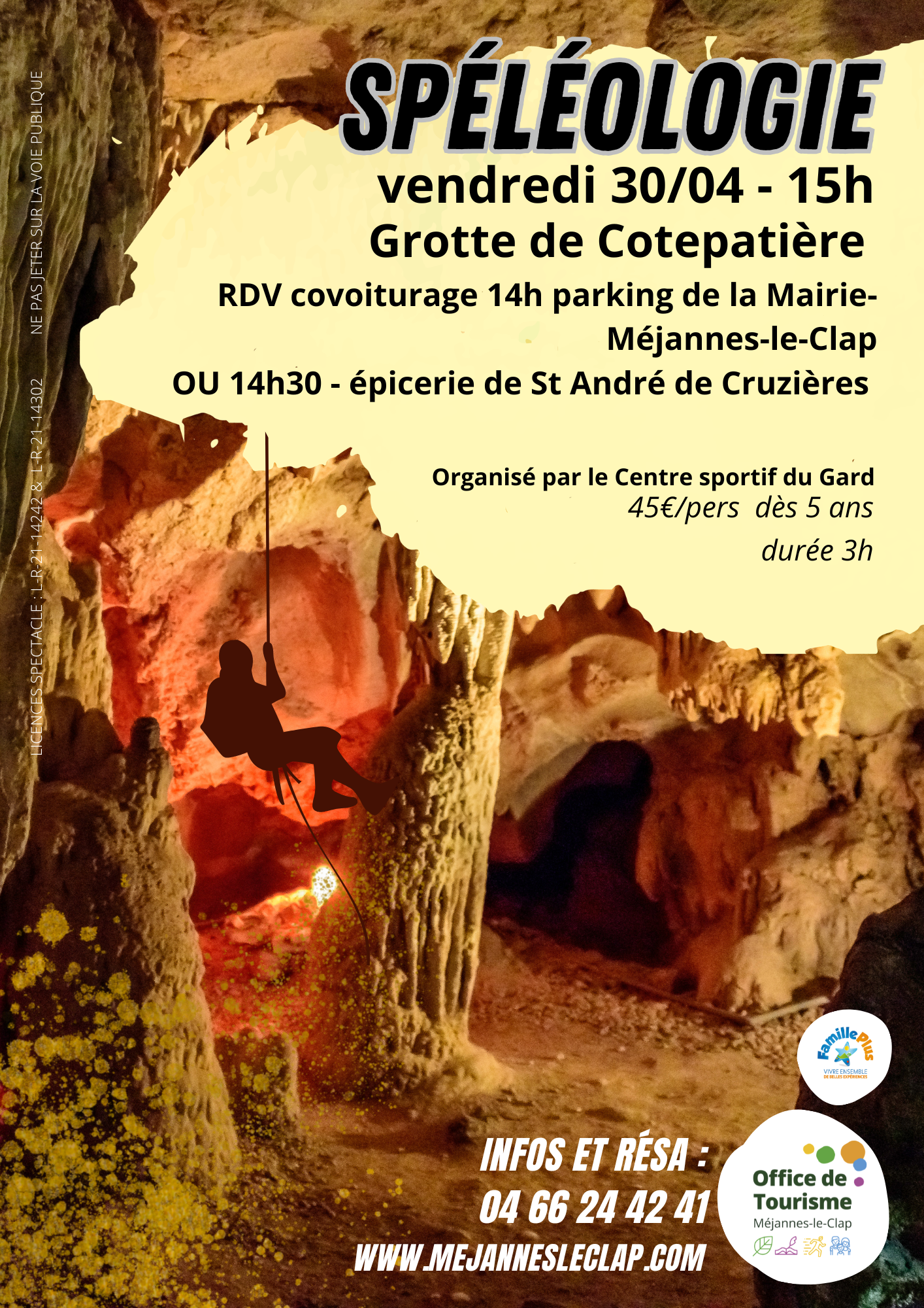 Une activité organisée par le Centre sportif du Gard. Accessible dès 5 ans. Dure 3 heures. Le point de RDV pour le covoiturage est à 14h sur le parking de l’Office de Tourisme. Pour les participants ne souhaitant pas covoiturer, le RDV est à 14h30 à l’épicerie de St André de Cruzières. L’activité se déroulera à la Grotte de Cotepatière.